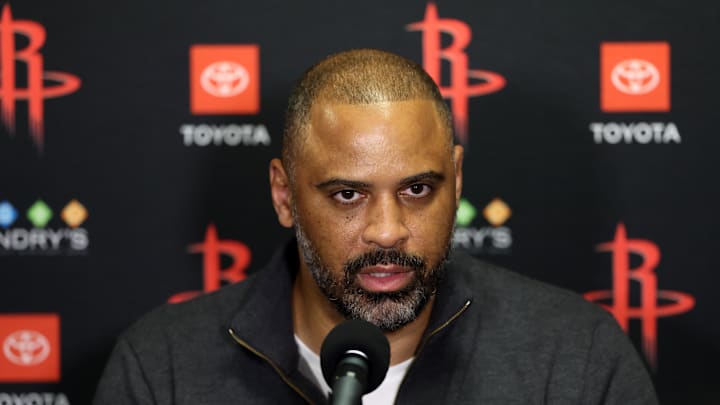 Houston Rockets head coach Ime Udoka speaks to media before the game against the Los Angeles Lakers / Kiyoshi Mio-Imagn Images