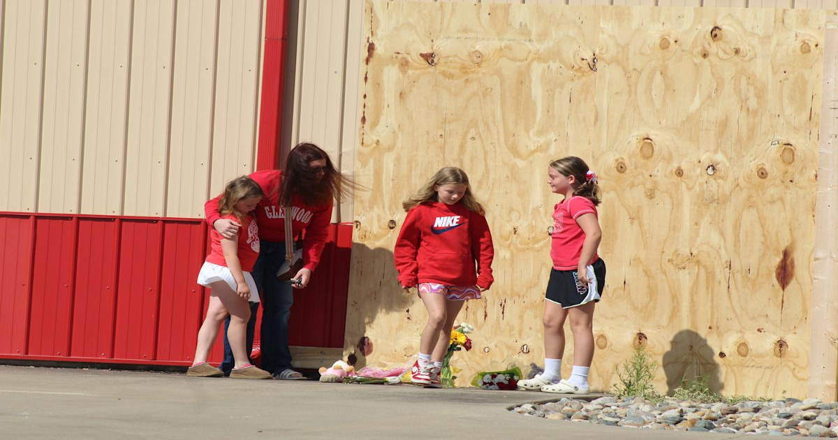 Jennifer Walston and her three daughters place flowers and stuffed animals outside of the YNOT Outdoor building on April 29, 2025, to help remember two of the girls who lost their lives.