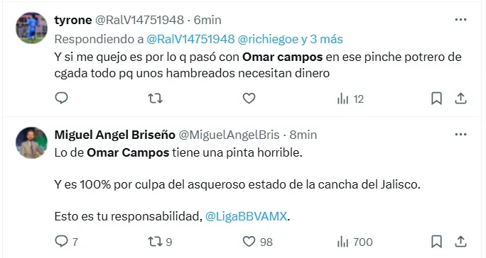 Uno de los más afectados fue Omar Campos. Sobre el cierre del encuentro, el defensa intentó evitar (sin éxito) que el balón saliera por línea de fondo, pero en el trayecto su rodilla quedó atorada en el césped, lo que le impidió continuar con normalidad. Pese a que se reincorporó al juego, en la siguiente jugada tuvo que salir del campo de juego con evidentes muestras de dolor.