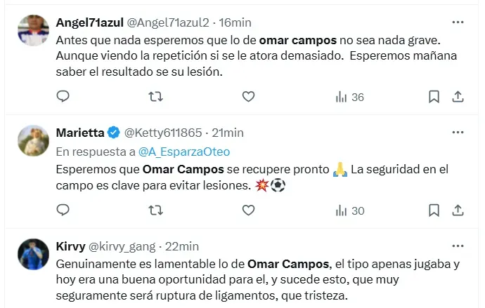 Tras el silbatazo final, la alegría del triunfo se vio opacada por esta situación, que trajo mucha preocupación en el cuerpo técnico de Vicente Sánchez y la afición. Y fue el reportero Adrián Esparza Oteo quien informó que Campos fue revisado en el vestidor por el fuerte dolor de su rodilla. Además, el colega Gerardo González dio a conocer que este domingo le realizarán estudios para tener un diagnóstico y conocer la gravedad de la lesión.