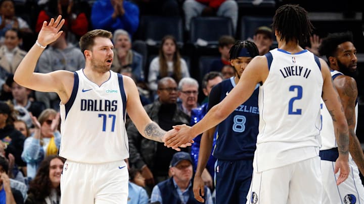 Oct 30, 2023; Memphis, Tennessee, USA; Dallas Mavericks guard Luka Doncic (77) reacts with center Dereck Lively II (2) during the first half against the Memphis Grizzlies at FedExForum. Mandatory Credit: Petre Thomas-Imagn Images / Petre Thomas-Imagn Images