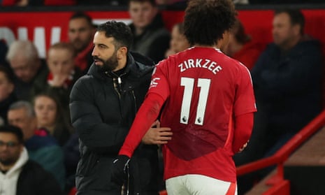 Manchester United’s Joshua Zirkzee gets hooked by manager Ruben Amorim. Photograph: Lee Smith/Action Images/Reuters