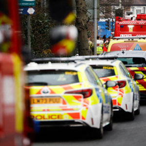 Police vehicles and fire engines are seen near the scene where a fire broke out at a substation supplying power to Heathrow Airport in Hayes, west London on March 21,…