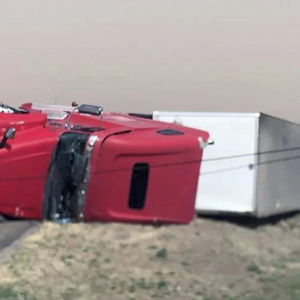 “It was a scary ride, I’ll tell you that,” said Mark Nelson of Wisconsin as he waits with his semi-trailer after it overturned during high winds and a possible tornado…