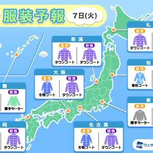 2025/01/06 16:55 ウェザーニュース 今日と明日の気温変化を比較して、気温に適した服装をご提案します。ウェザーニュースの服装予報もご活用ください。 » この先10日間の服装予報 札幌の気温変化 明日の朝も冷え込みは控えめです。昼間の気温は今日と同じくらいになる見込みです。 厳しい寒さではないものの風が冷たく感じられます。暖かな服装でお出かけください。 東京の気温変化 昼間は今日より気温が高くなる予想です。天気が回復し、寒さは控えめになります。 日差しの温もりが感じられ、それほどの厚着をしなくても快適に過ごせそうです。 福岡の気温変化 明日は朝の冷え込みは控え目です。昼間は寒気の影響を受け、それほど気温は上がりません。 冷たい風が強めに吹くこともありそうです。屋外では真冬らしい防寒が欠かせません。 » 関連記事 1月の服装選びのポイント » GPS検索 ピンポイント天気予報» ピンポイント天気予報 札幌 仙台 新潟 東京 金沢 名古屋 大阪 広島…