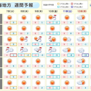 画像:tenki.jp 東海地方は、仕事はじめの今日6日は、広い範囲で冷たい雨が降っています。この雨のあとは強い寒気が流れ込み、今週後半は一段と寒さが厳しくなりそうです。山間部では大雪の恐れがあり、名古屋でも雪の降る日があるでしょう。寒さと雪への対策を万全にしてお過ごしください。 東海地方の2週間天気 画像:tenki.jp 今日6日の東海地方は、朝から所々で弱い雨が降りだし、正午現在、まとまった雨雲が東海地方にもかかってきました。正午の気温は、名古屋で6.3℃、岐阜で5.4℃、高山で氷点下0.2℃、津で5.8℃、静岡で8.7℃を観測しています。この後も、あまり気温が上がらず、最高気温は10℃に届かない所がほとんどでしょう。暖かくしてお過ごしください。 この後、低気圧や前線が本州付近を通過するため、夕方にかけて広い範囲で本降りの雨となるでしょう。夜は、西から次第に雨はやんできそうです。 なお、低気圧に向かって比較的暖かな空気が入っているため、山間部では湿った雪となっています。積雪の多い地域では、落雪やなだれに注意してください。路面状況も悪くなっているため、車の運転は慎重にするようにしてください。 画像:tenki.jp 明日7日は、低気圧や前線が東の海上へ進み、日本付近は冬型の気圧配置へ変わる見込みです。東海地方には次第に強い寒気が流れ込み、寒気は強弱をつけながらしばらく居座るでしょう。 上空5500メートル付近には、大雪の目安となる強い寒気が流れ込む予想です。また、東海地方の上空1500メートル付近には、マイナス9℃以下の寒気が流れ込み、東海地方は冷たい空気にすっぽり覆われる見込みです。平野部で降れば確実に雪となるような寒気のレベルです。 明日7日以降、週後半にかけて岐阜県山間部では雪が降り続き、警報級の大雪になる恐れがあります。東海地方の平野部にも雪雲の流れ込む日があるでしょう。名古屋など濃尾平野周辺では、9日(木)や10日(金)に雪の降る時間がありそうです。 風向き次第では雪のエリアが変わってきますので、最新の気象情報をこまめに確認するようにしてください。 画像:tenki.jp 名古屋の平年の気温を見ますと、この時期は最低気温は1℃、最高気温は9℃前後です。 今週は、最低気温、最高気温ともに、平年並みか平年より低い日が多いでしょう。特に、週後半は、一番寒い時期を下回り、名古屋など平野部でも極寒となりそうです。また、山間部などでは、水道が凍結するような厳しい冷え込みになる所もあるでしょう。新学期のスタートは厳しい寒さとなります。体調管理に気をつけてお過ごしください。 日本気象協会 中部支社 竹下 のぞみ
