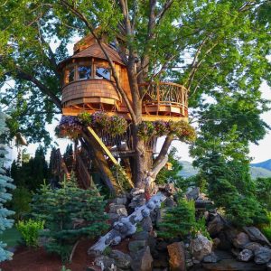 This treehouse is located in the middle of a forest at the foot of the mountains. A ladder is used to climb the tree house, and this climb offers an…