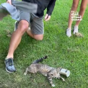 El gato gritó de dolor por estar atrapado en una caja en su cabeza.