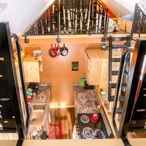 This tiny house makes the most of space with its carefully thought-out design. The interior is arranged in an open-plan layout. The entrance, kitchen, and living room are combined in…