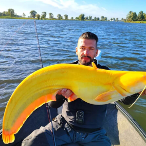 Hombre aturdido en los Países Bajos después de capturar un bagre enorme y excepcionalmente raro de color plátano Un bagre típico es gris o marrón. Uno en un millón, un individuo…