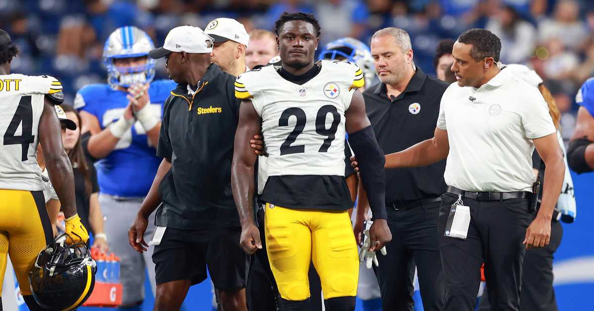 Amy Lemus/NurPhoto via Getty ImagesDETROIT,MICHIGAN-AUGUST 24: Pittsburgh Steelers DB Ryan Watts (29) walks off the field after an injury during a preseason game between the Detroit Lions and the Pittsburgh Steelers in Detroit, Michigan USA, on Saturday, August 24, 2024 (Photo by Amy Lemus/NurPhoto via Getty Images)