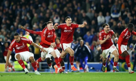 Nottingham Forest celebrate winning their third successive penalty shootout in this year’s FA Cup. Photograph: Toby Melville/Reuters