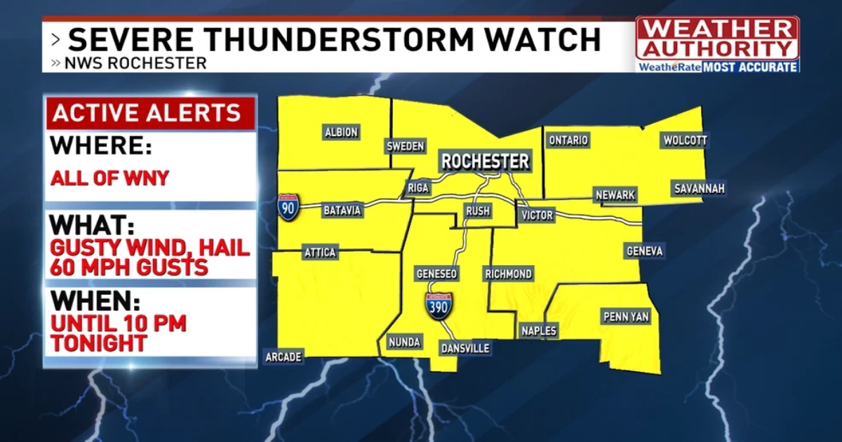 Rochester, NY (WHAM) – A severe thunderstorm watch has been issued for all of WNY until 10pm this evening.