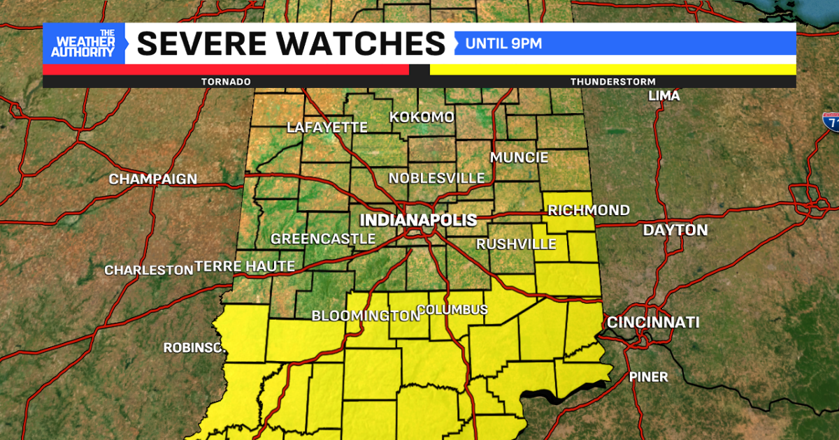A Severe Thunderstorm watch has been issued for portions of Central Indiana until 9pm. A line of storms is pushing through Central Illinois and is continuing to push east. These storms could produce damaging winds and large hail. An isolated tornado can’t be ruled out.