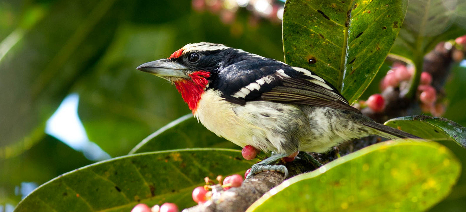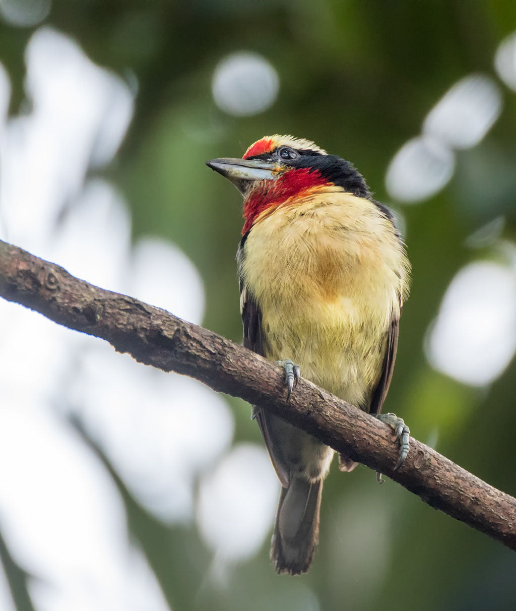 The Black-spotted Barbet spends much time in the mid to canopy-high range of trees. It occurs in subtropical and tropical moist lowland forests as well as subtropical and tropical swamps. It also inhabits heavily degraded former forests, and has been known venture into human habitats. Its range encompasses eastern Columbia, eastern Peru, Brazil, the Guianas, and Venezuela.