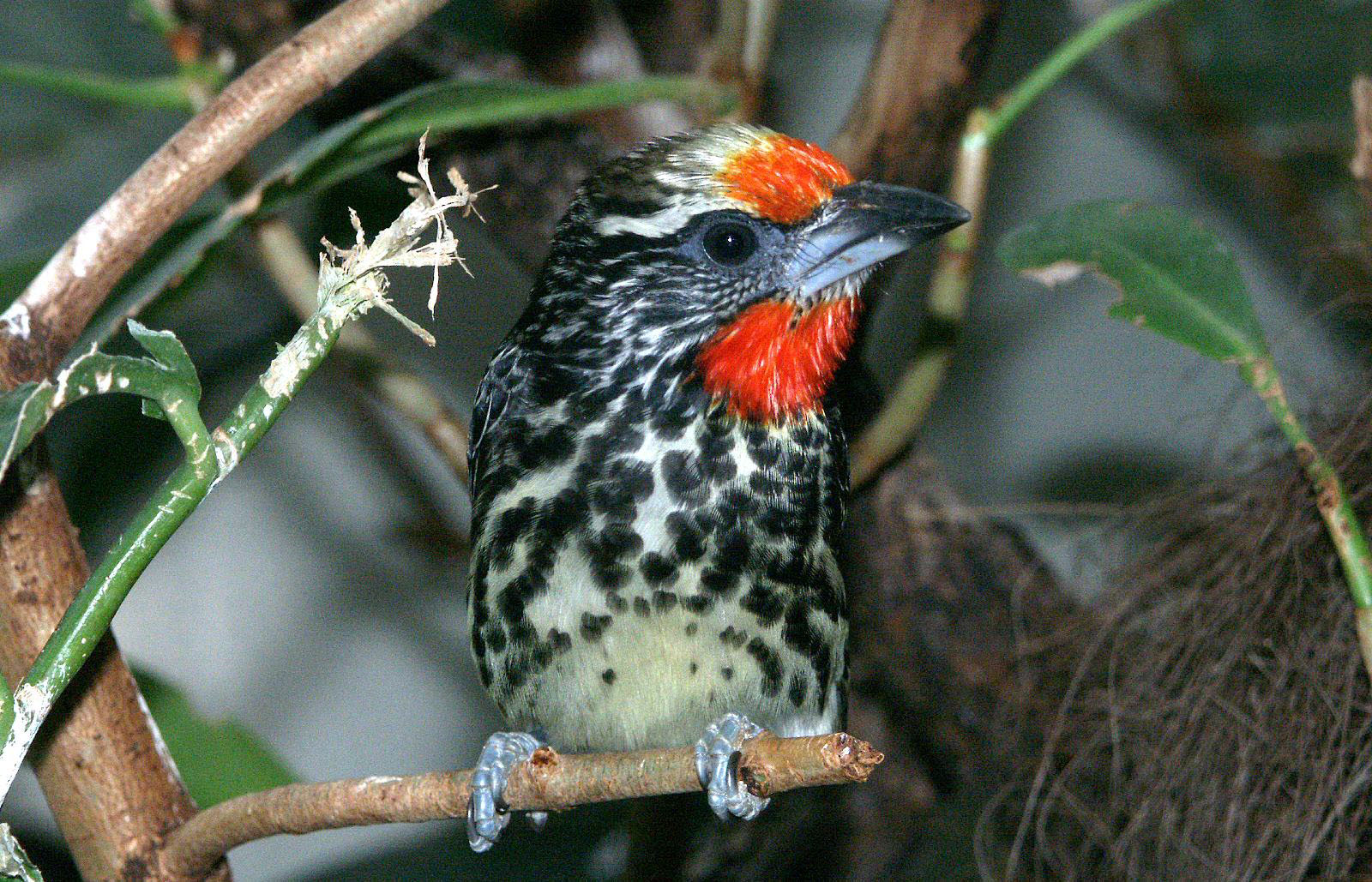 The Black-spotted Barbet nest in tree hollows, often century plant stalks or old woodpecker nests, but they will also excavates new holes in soft woods. The female lays 2 – 5 eggs per clutch, and both parents incubate the eggs for about 18 days. Fledging occurs at around day 30. The young are dependant on their parents and possess heal pads that assist them in the bottom of the nest.