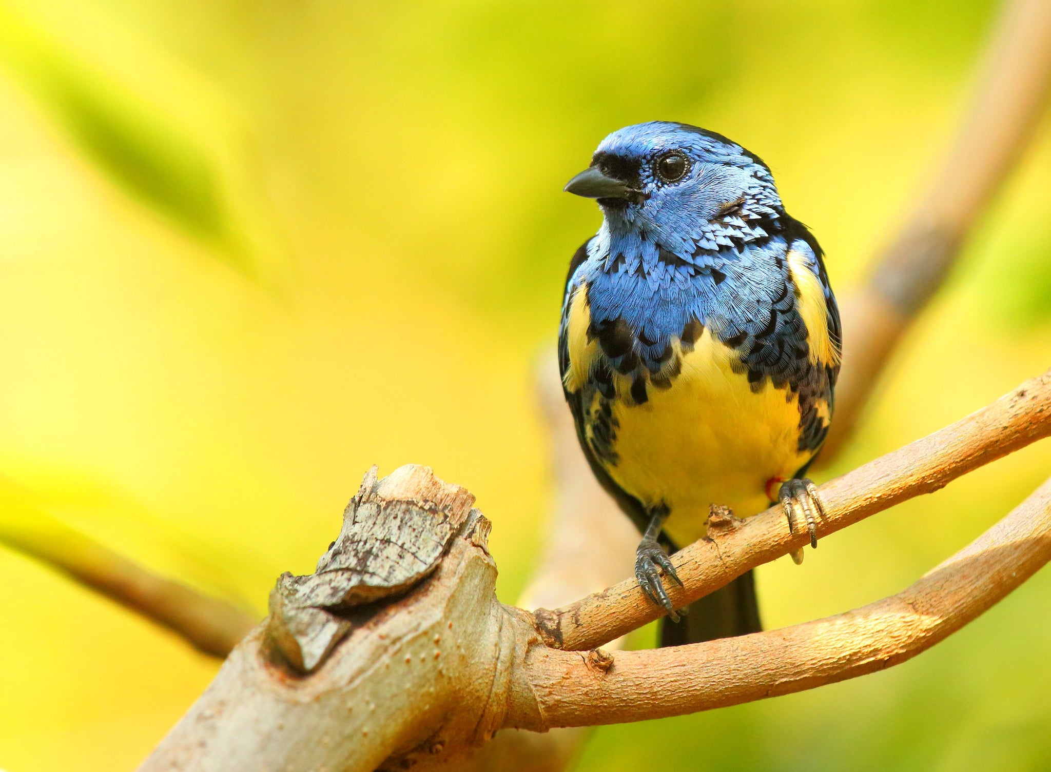 Description: These medium-sized birds are about 13 – 14 centimeters (51/2 inches) long, including their tail and they are about 20 grams in weight. Their feathers at maturity are mostly black and blue, in addition to the distinctive turquoise edging found on the main wing plumage. The majority of these birds have a yellowish underside, with the exception of Brazilian Turquoise Tanagers which have a white underside.