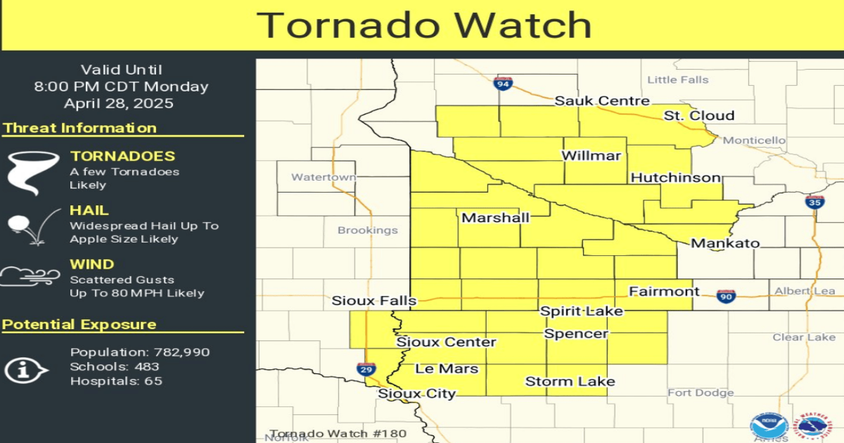 1230 PM CDT Mon Apr 28 2025 The NWS Storm Prediction Center has issued a * Tornado Watch for portions of Northwest Iowa Southwest Minnesota Extreme Southeast South Dakota