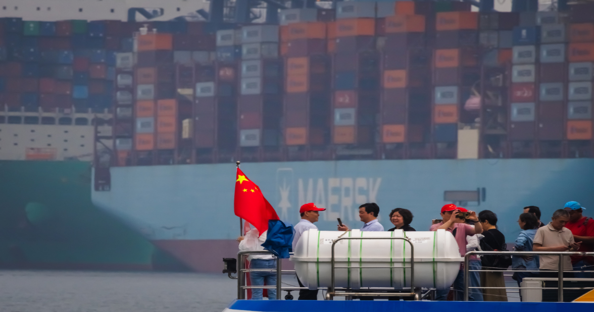 Tourists are seen onboard a sightseeing boat flying the Chinese national flag, with a Maersk container ship and stacked shipping containers in the background at the Yantian International Container Terminal, on April 12, 2025 in… Tourists are seen onboard a sightseeing boat flying the Chinese national flag, with a Maersk container ship and stacked shipping containers in the background at the Yantian International Container Terminal, on April 12, 2025 in Shenzhen, China. Photo by Cheng Xin/Getty Images