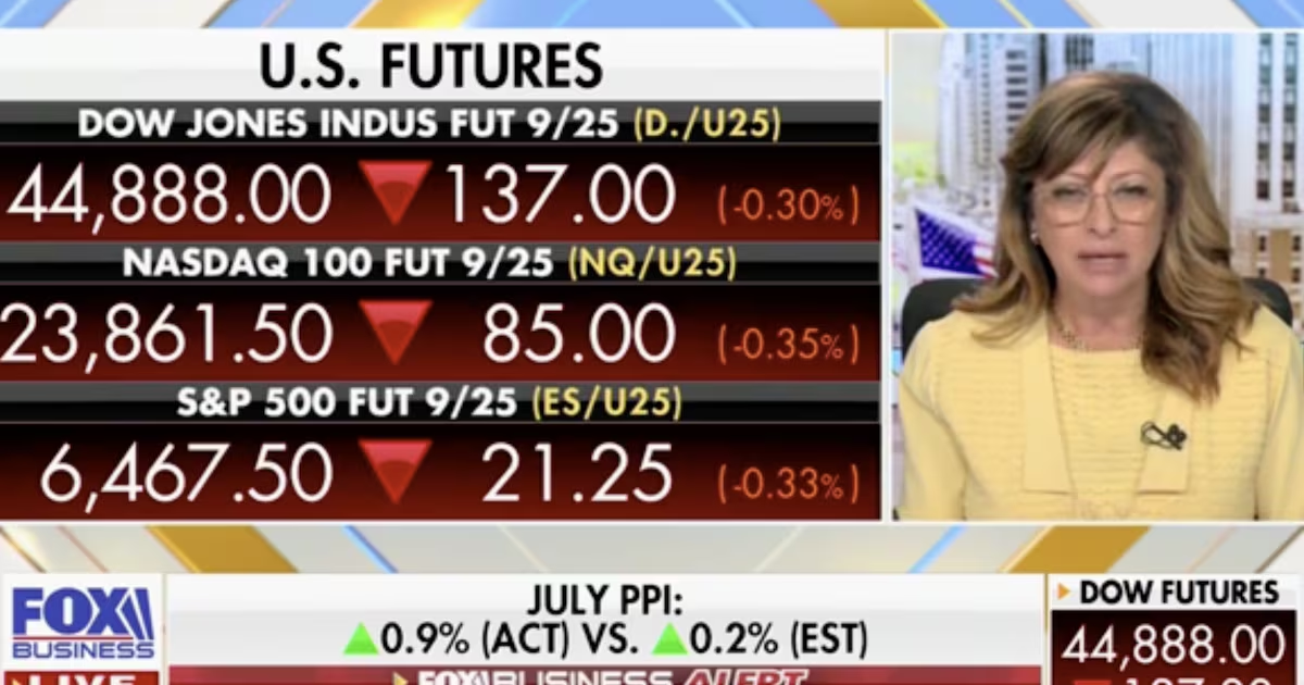 Fox Business Host Maria Bartiromo was live on air when the Producer Price Index report for July was released by the Bureau of Labor Statistics, revealing that prices for wholesalers rose last month at the fastest pace in three years.