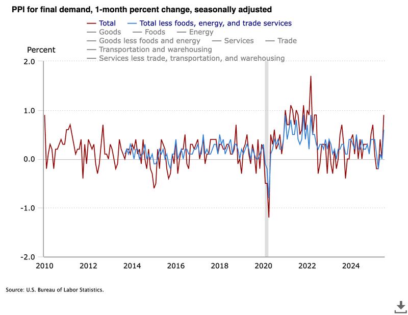 The PPI index rose 0.9% in July alone—more than four times what was expected, Bartiromo said. For the past year, the index rose 3.3%, the largest annual increase since February.