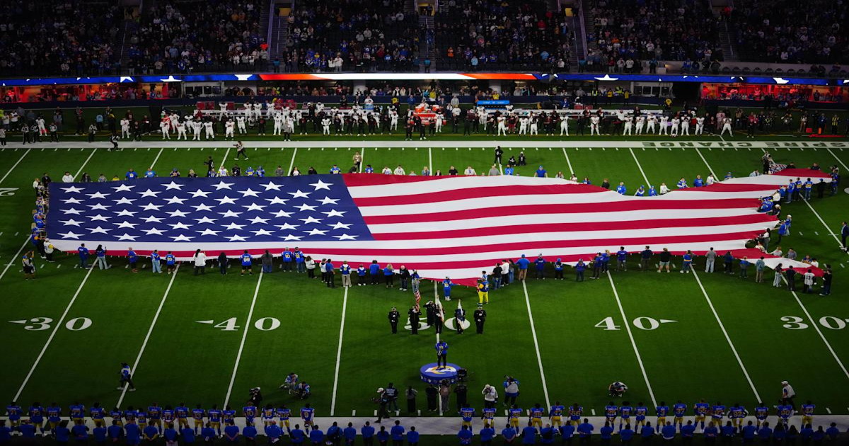 A general overall view of a United States flag on the field as saxophonist Michael Phillips performs the national anthem before the game between the Arizona Cardinals and the Los Angeles Rams at SoFi Stadium. (Kirby Lee-Imagn Images) · USA TODAY Sports via Reuters Connect / Reuters