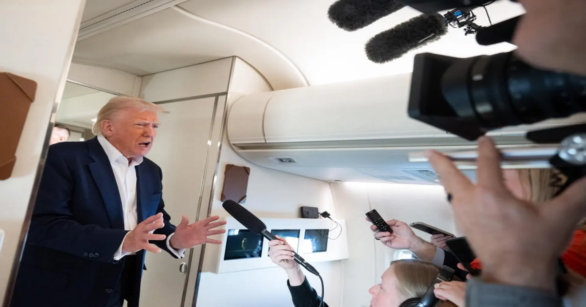 US President Donald Trump speaks with the media aboard Air Force One as he flies from West Palm … More Beach, Florida enroute to Joint Base Andrews in Maryland, on May 4, 2025 returning to the White House after spending the weekend in Florida. (Photo by SAUL LOEB / AFP) (Photo by SAUL LOEB/AFP via Getty Images)