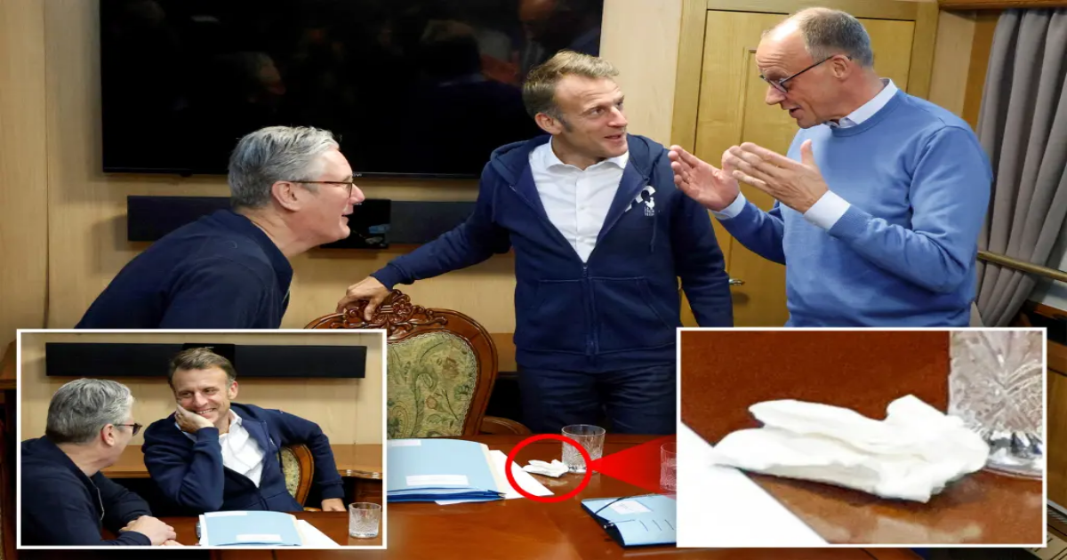 Macron is seen hurriedly removing a crumpled tissue off the table, which conspiracy theorists claimed was a bag of cocaine, while Merz was alleged to be handling a white spoon for cocaine as cameramen film the three world leaders.